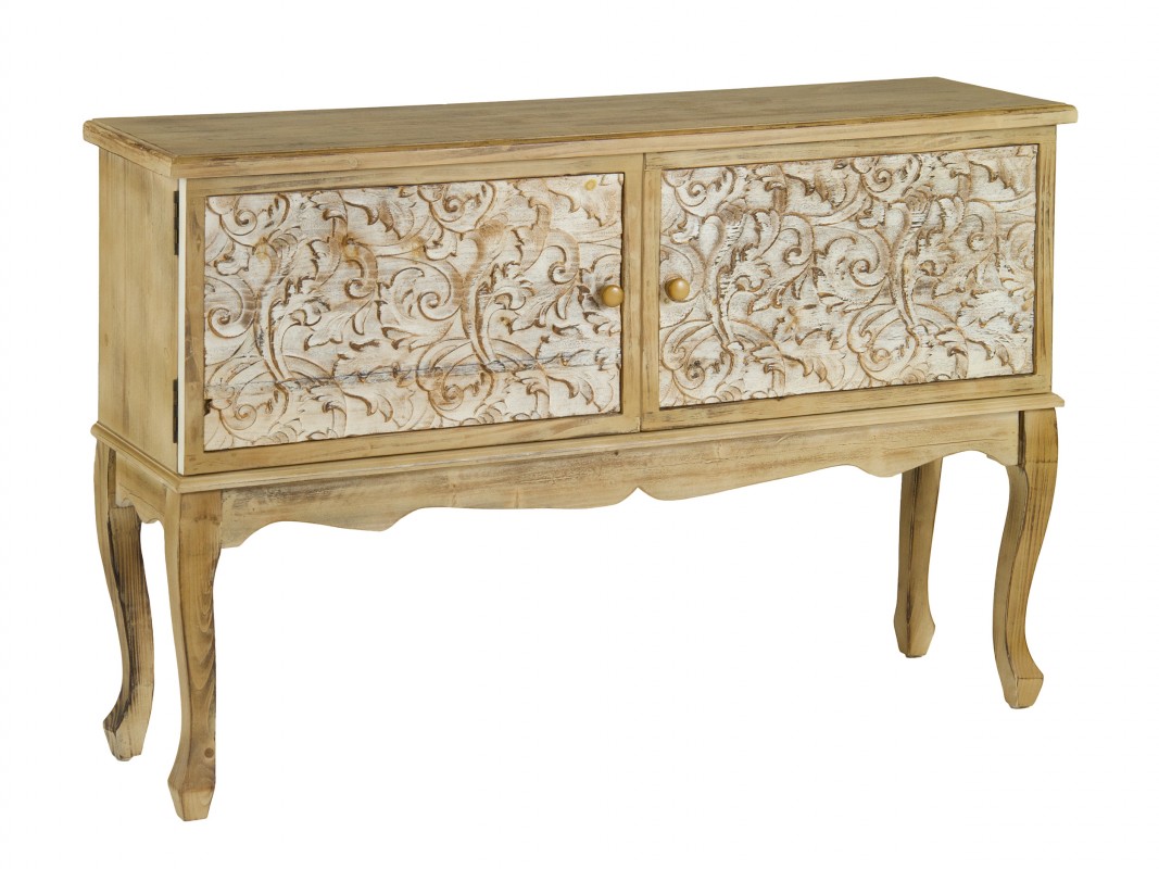 Aparador isabelino estilo vintage hecho en madera de pino y DM con doble puerta abatible. Un mueble de elegante diseño antiguo levantado sobre cuatro sinuosas patas que te ofrece un interesante espacio de almacenaje para el salón.