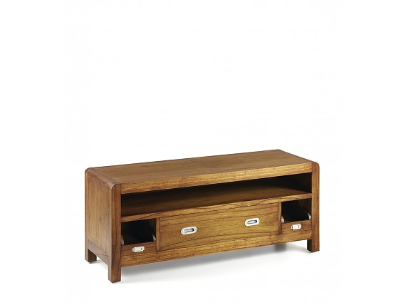 Un formidable mueble aparador de estilo colonial y marcado carácter artesanal. Construido en madera de mindi, cuenta con cuatros cajones y doble armario con puerta de cristal.
