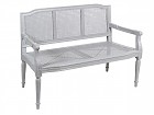 Precioso banco clásico de madera para jardín o terraza con asiento y respaldo de ratán en color gris claro. Cuenta con bellos y sinuosos detalles en sus patas, bordes y reposabrazos.