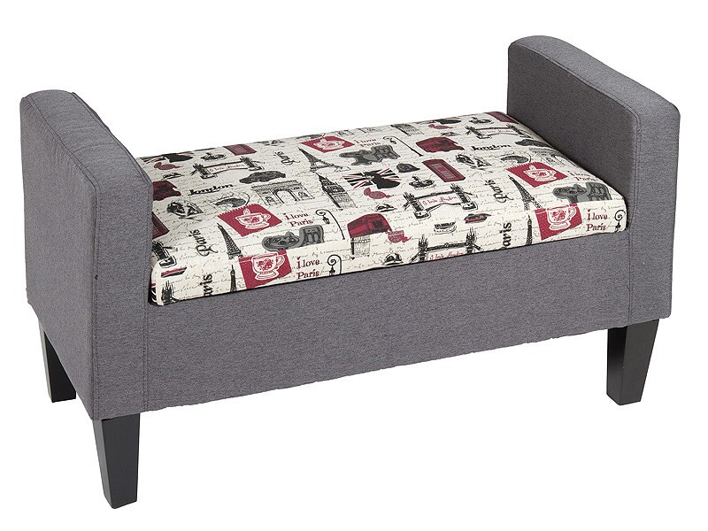 Banqueta-baúl de madera y tela con apoyabrazos en homenaje a las emblemáticas ciudades de Londres y París. Válida para el pie de cama o para decorar cualquier otra estancia de la casa.