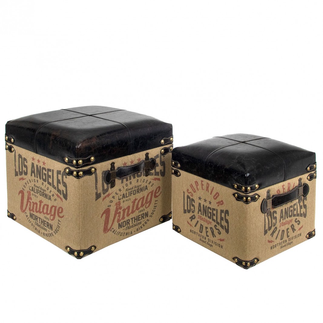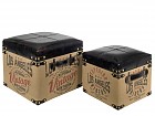 Juego de dos baúles puff de pequeño tamaño decorados con estampados vintage y correas, asiento de aire industrial. Realizados en madera tapizada, se trata de dos piezas de estilo vintage válidas tanto para sentarte, apoyar los pies, guardar pequeños objetos o simplemente decorar una estancia.