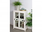 Un elegante y práctico mueble botellero de estilo colonial nórdico, fabricado en madera de mindi de color blanco, con dos puertas correderas de cristal transparente.