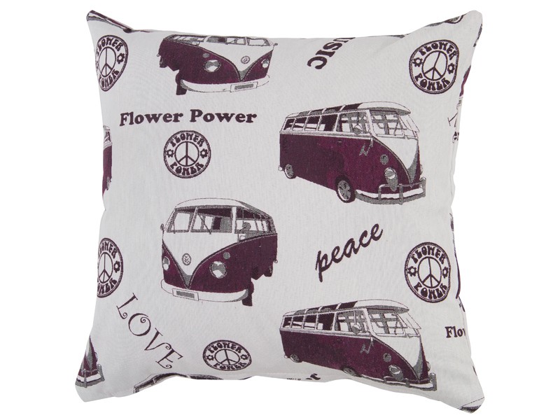 Un original cojín cuadrado de 45x45 para sofá o cama realizado con relleno de algodón y funda de poliéster, decorado con dibujos y leyendas de color morado en honor al famoso movimiento hippie: la antigua furgoneta Volkswagen, el símbolo del flower power, las palabras "Love" y "Peace", etc.