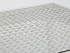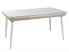 Set de jardín compuesto por una mesa con seis sillas a conjunto, todo realizado con estructura de aluminio blanco y rematado con ratán sintético en tono crema. Además, las sillas incluyen un cojín azull cada una y la mesa un tablero de cristal transparente.