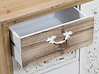 Consola auxiliar tipo aparador de estilo retro, válida tanto para la entrada como para el salón. Realizada en madera de abeto y dm con acabado avejentado de color natural con dos de los tres cajones y la puerta de armario pintados en blanco y decorados con grabados en relieve.