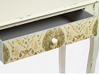 Consola vintage con un cajón estampado de estilo hindú en tonos cálidos. Realizada en mdf y madera de pino con un precioso efecto decapado que, unido a sus suaves formas isabelinas, le confiere una gran belleza y elegancia.