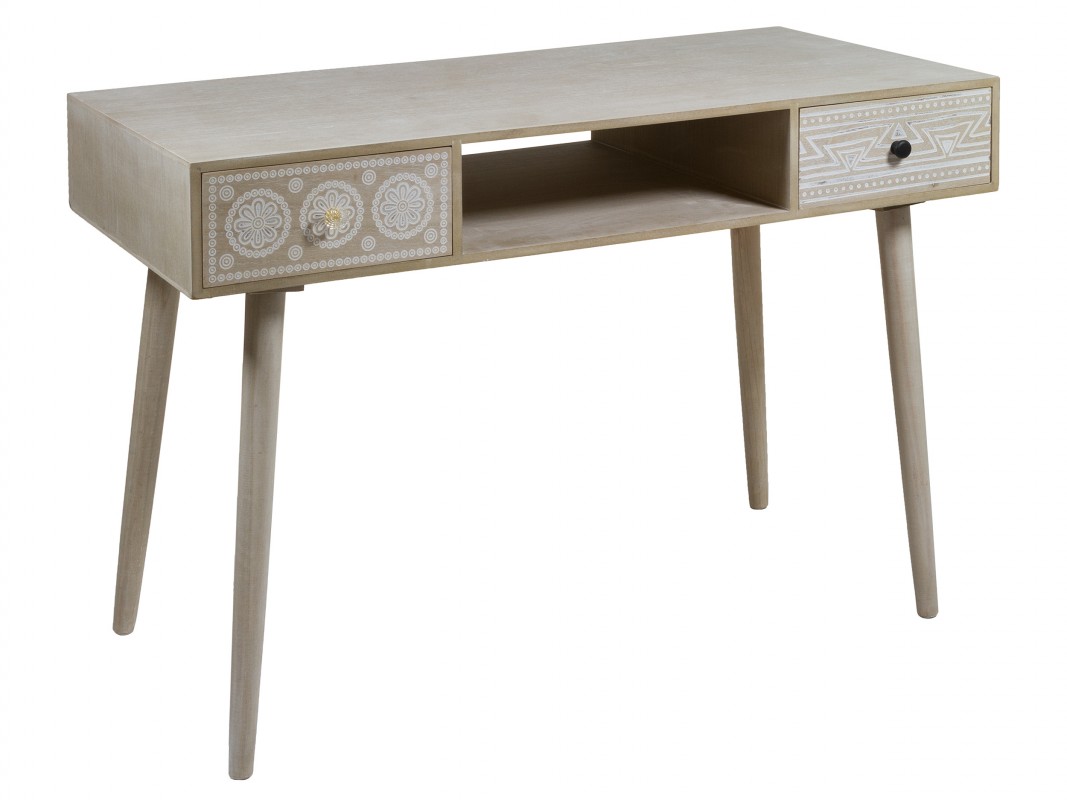 Precioso escritorio de pino de Nueva Zelanda, madera de paulownia y mdf en color crudo, alzado sobre cuatro patas inclinadas. Dispone de una balda abierta y de dos pequeños cajones decorados con motivos en blanco.