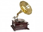 Preciosa réplica de uno de los más antiguos sistemas de grabación y reproducción de sonido de la historia. Una pieza de gran valor decorativo fabricada en latón, madera y metal de color marrón y dorado. Cuenta con una membrana de sonido, una palanca de cuerda y una palanca de revoluciones y bloqueo.