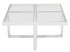 Conjunto de elegante estilo colonial nórdico formado por una mesa de centro cuadrada de madera de mindi y cristal, y 4 taburetes bajos con cojines, todo en un bello color blanco.