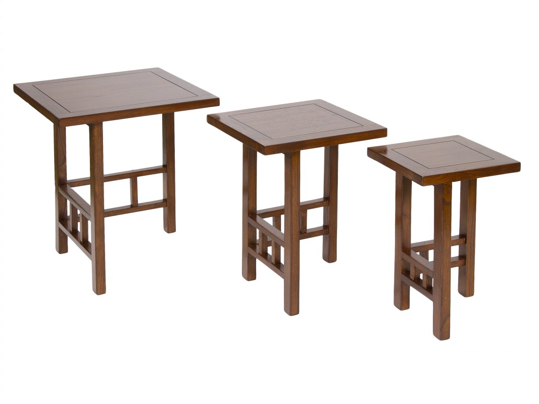 Mesa nido estilo colonial realizada en madera de acacia de primera calidad. Un conjunto compuesto por tres mesas auxiliares de elegante y original diseño, ya que cada una de ellas se levanta sobre tres pies.