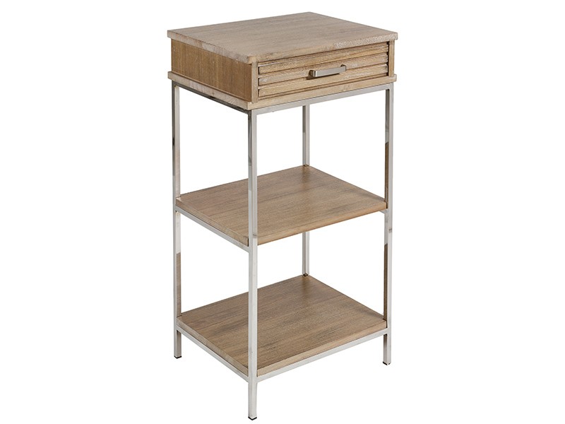 Mesa auxiliar con estructura de acero inoxidable y tableros de madera de teca en acabado natural envejecido. Cuenta con un práctico cajón y dos estantes abiertos. Ideal para el salón, pero válida también para cualquier otra estancia.