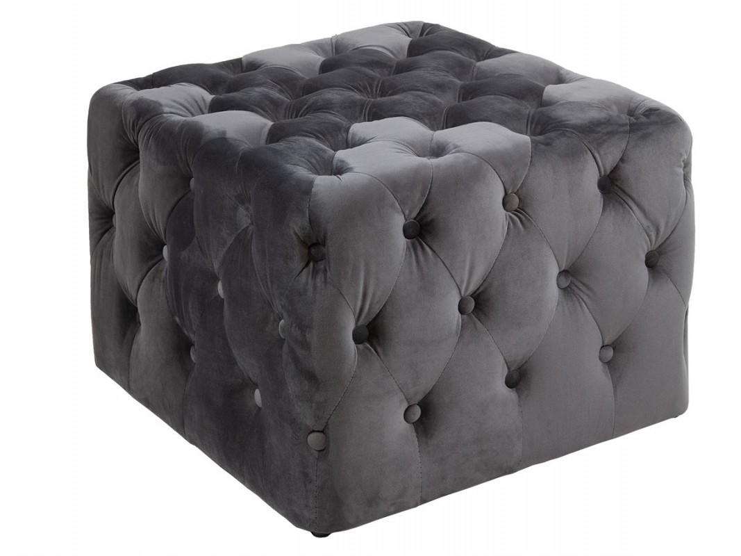 Una coqueta banqueta tipo puff hecha con estructura de madera de haya, rellena de espuma y tapizada en suave tela de terciopelo con un precioso acabadado de botones capitoné.