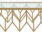Maravilloso mueble recibidor alzado sobre una estructura de hierro en color dorado decorada con formas geométricas y culminado con una alargada superficie de cristal transparente.