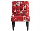 Precioso sillón con patas de madera y asiento y respaldo de poliéster en color rojo, decorados con bonitos y exóticos dibujos de aire oriental. El respaldo está rematado con botones capitoné que potencia la belleza del mueble.
