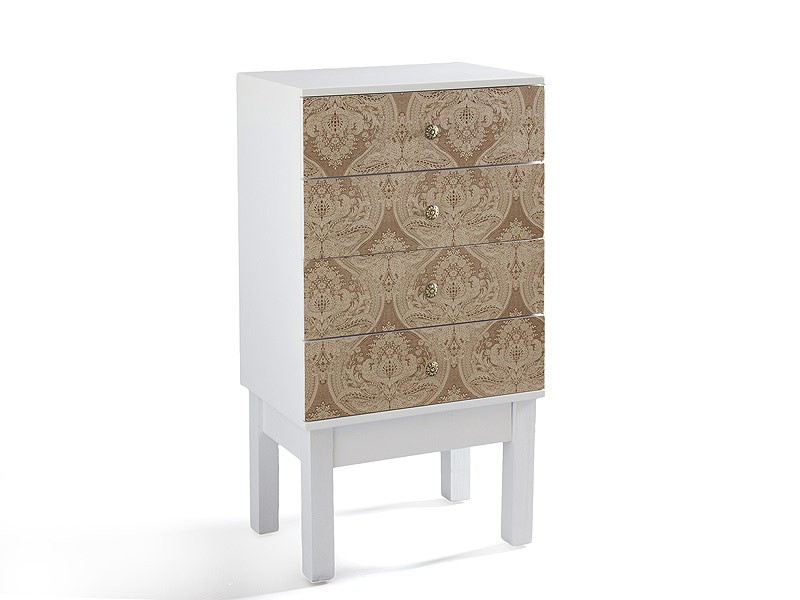 Una refinada pieza tan funcional como estética, fabricada en madera y acabada en un hermoso y luminoso color blanco. Incluye cuatro cajones estampados de marrón y una empuñadora redonda color dorado en cada uno de ellos.