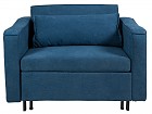 Sillón cama de diseño contemporáneo alzado sobre una estructura de madera de álamo y hierro y acabado con un confortable asiento de poliéster (en color azul o negro) relleno de espuma.
