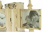 Fantástico y original sujetalibros realizado en metal de color beige y acabado con un efecto pelado que le da un romántico estilo vintage. Incorpora un reloj y un pequeño marco fotográfico.