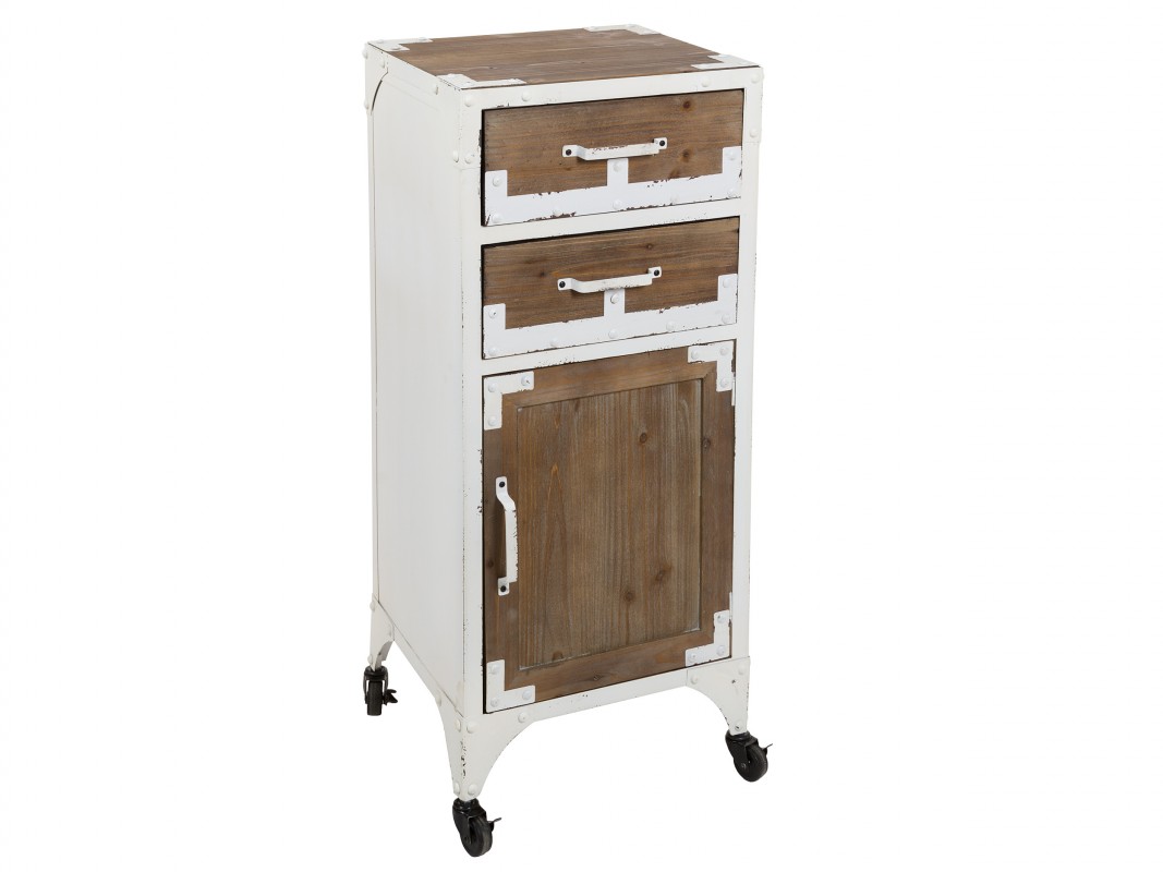 Mueble telefonero con ruedas de estilo industrial vintage realizado a partir de una estructura de hieror en color blanco envejecido y acabado con madera de abeto también avejentada. Cuenta con ruedas para su cómodo desplazamiento, así como dos cajones y una puerta de armario.
