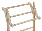 Elegante toallero de pie de estilo clásico realizado en madera de abeto con sinuosas líneas que realzan su belleza. Dispone de cuatro barras torneadas por su parte central, que te permitirán colgar varias toallas en el cuarto de baño.