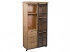 Fantástica alacena de estilo industrial vintage realizada principal en abeto laminado en color natural y rematada con una bonita y práctica puerta deslizante de hierro en color negro con cuerterones de vidrio esmerilado. Dispone de cinco estantes y tres cajones, y se levanta sobre cuatro pequeñas ruedas.