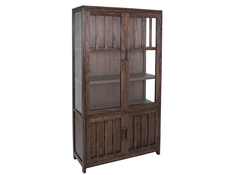 Alacena colonial rústica realizada en madera de mindi y acabada en un precioso tono nogal envejecido que le confiere un precioso diseño. Dispone de dos grandes puertas acristaladas y otras dos más pequeñas totalmente de madera.